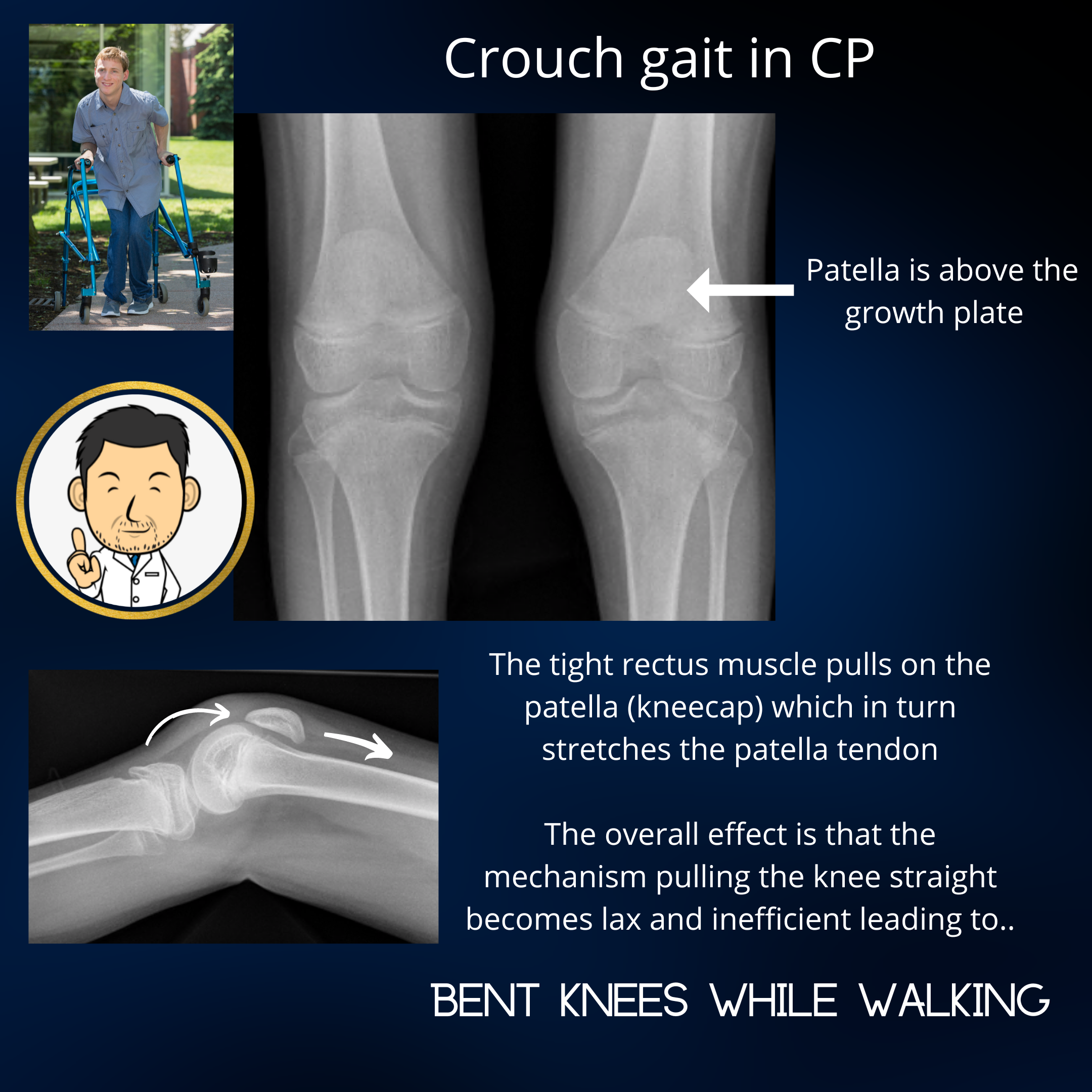 - Patella tendon distalisation (see case below) - Important to be aware that the flexed knee doesn't primarily develop because the hamstring flexor muscles are too tight. Rather it is the converse situation - the quads muscles on the front have become "baggy" and redundant. Imagine a rope infront of the knee that is taut when pulling the knee straight. Now imagine what happens when you give the rope a bit of slack. Pulling on it will transfer some force to making the knee straight but likely will not produce complete knee straightening because of the redundancy. It is the same phenomenon in the flexed knee in Cerebral palsy - the quadriceps muscle on the front of the knee has become stretched out, "baggy" and redundant. Studies support the observation that restoring the normal length tension relationship of the quadriceps muscle is more important than making the knee straight. I usually undertake surgery to re-tension the quadriceps mechanism by re-attaching the tendon downstream or by transferring it's bony attachment further down the tibia.