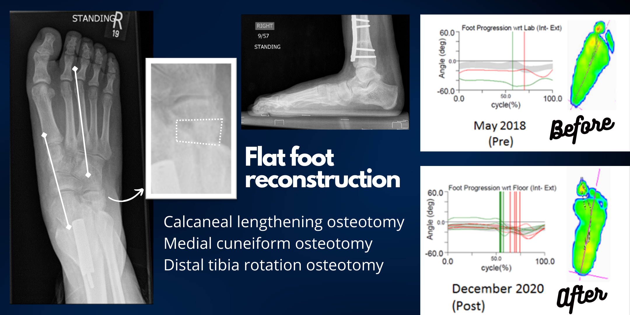 - Foot bony surgery - In young patients with excellent function, preserving the anatomy of the foot as close to normal is highly desirable. My preference for flat feet in cerebral palsy is to do a biological reconstruction with calcaneal lengthening and medial cuneiform osteotomies supplemented with tendon procedures. In patients with limited walking potential and fairly severe flatfoot deformity, a hindfoot fusion is a good option to provide a stable base for walking, especially where I feel that osteotomies would be insuffcient to correct a severe deformity.